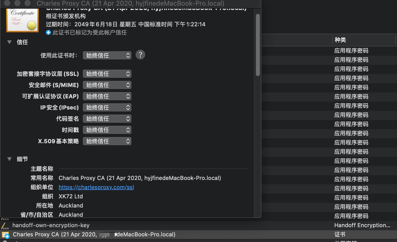 电脑安装根证书,在Charles软件的help里点击SSL Proxying->Install Charles Certificate,然后在钥匙串里找到这个证书(可以搜索),双击,展开信任选项,选择始终信任: